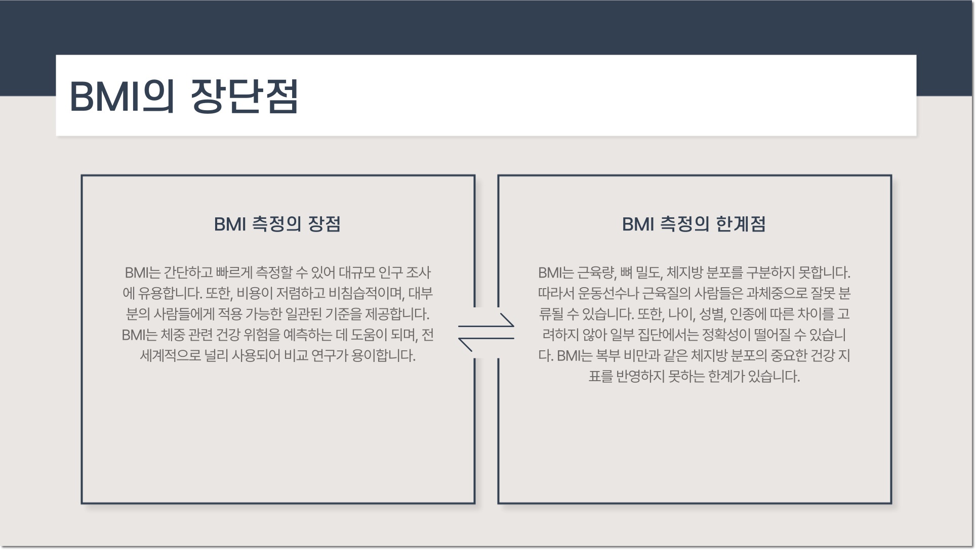 BMI는 상대적으로 간단한 계산법으로 인해 널리 사용되고 있으며, 공공 건강 정책에서도 중요한 역할을 합니다. 그러나 BMI 수치가 체지방률을 직접적으로 반영하지는 않으므로, 다른 건강 지표와 함께 종합적으로 고려하는 것이 중요합니다.
