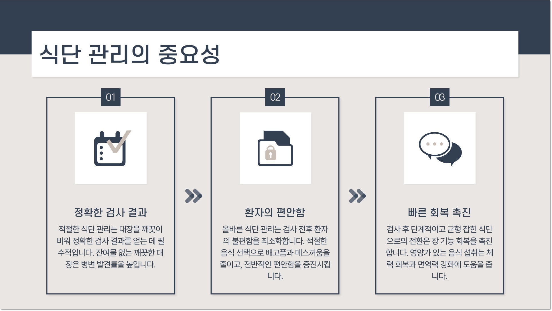 따라서 일반적으로 약 일주일 전부터는 섬유소가 적은 식품을 선택하고, 검사 1-2일 전에는 액체 중심의 식사를 권장합니다. 이 과정에서 신체가 적절히 준비되지 않으면, 검사 일정이 연기될 수 있으며, 이는 환자에게 불편과 스트레스를 초래할 수 있습니다. 따라서 식단 조절을 철저히 하는 것이 중요합니다.