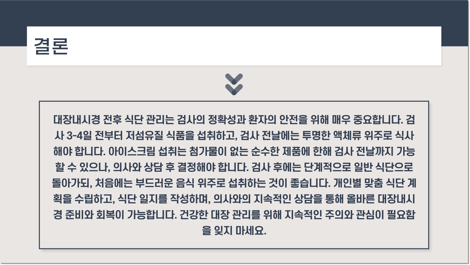 대장내시경 전후 식단 관리는 검사 후 회복과 장 건강 유지에 매우 중요합니다. 전에는 섬유소가 적은 식단을 유지해야 하며, 검사 후에는 점차 정상 식단으로 복귀하는 것이 바람직합니다.