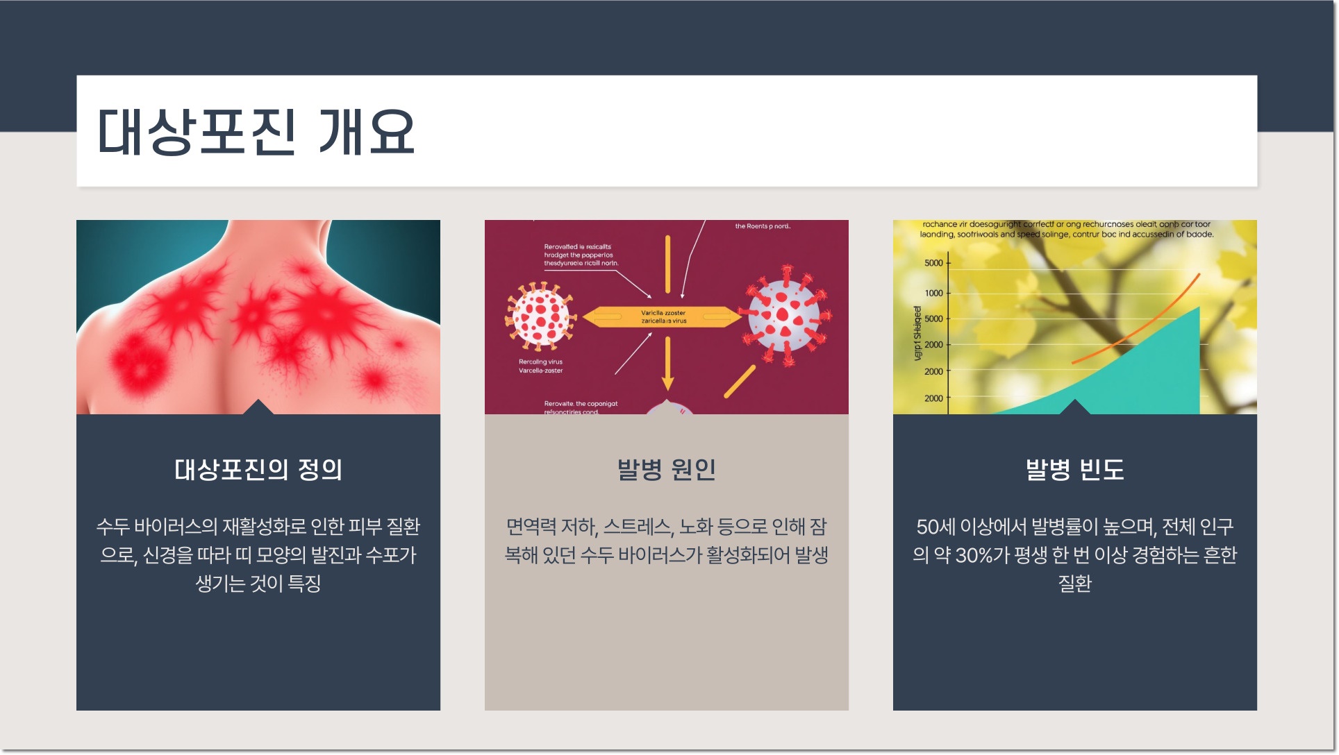 발진은 주로 몸의 한쪽에 띠 모양으로 나타나며, 극심한 가려움증과 함께 통증이 동반될 수 있습니다. 이 질환은 모든 연령대에서 발생할 수 있지만, 보통 50세 이상의 성인에서 더 흔히 나타납니다. 초기 증상으로는 피로감, 두통, 그리고 신경 통증이 나타날 수 있으며 이로 인해 일상생활에 많은 영향을 미칠 수 있습니다.