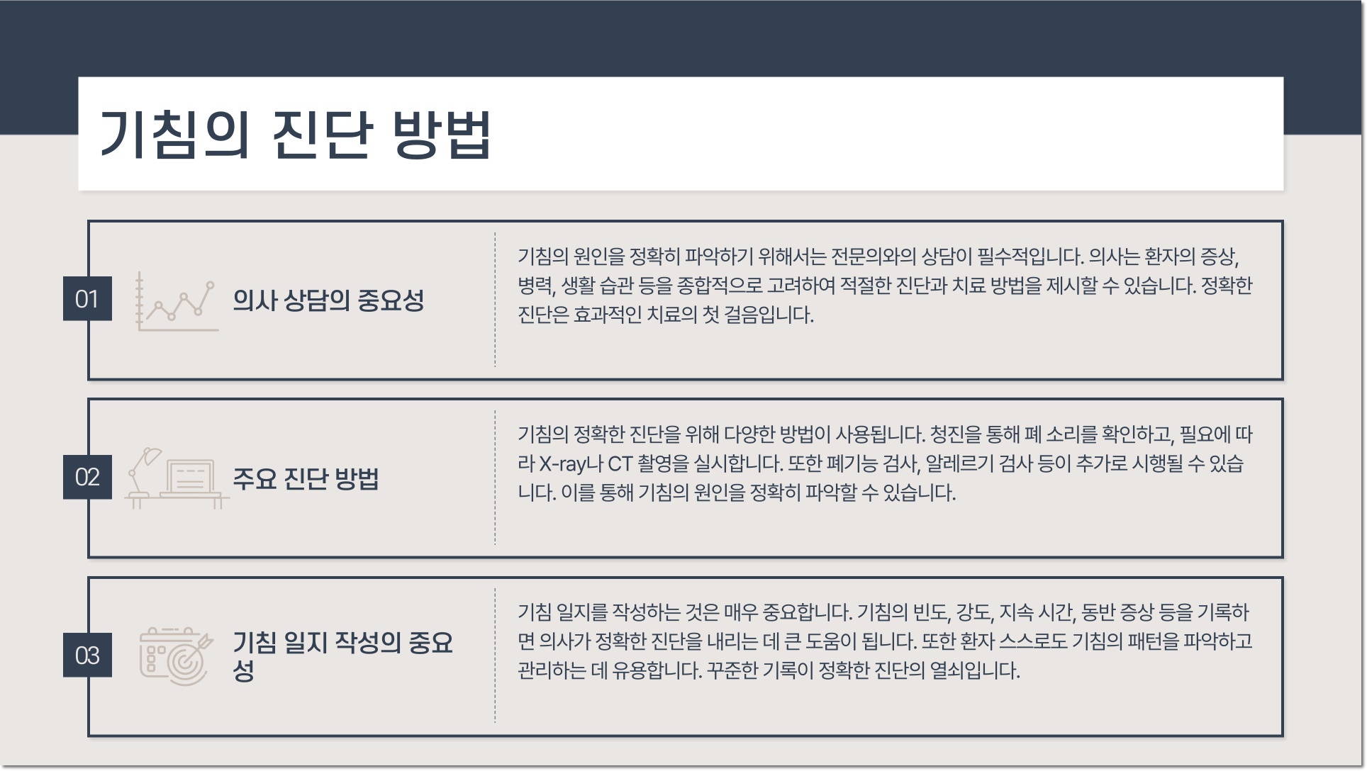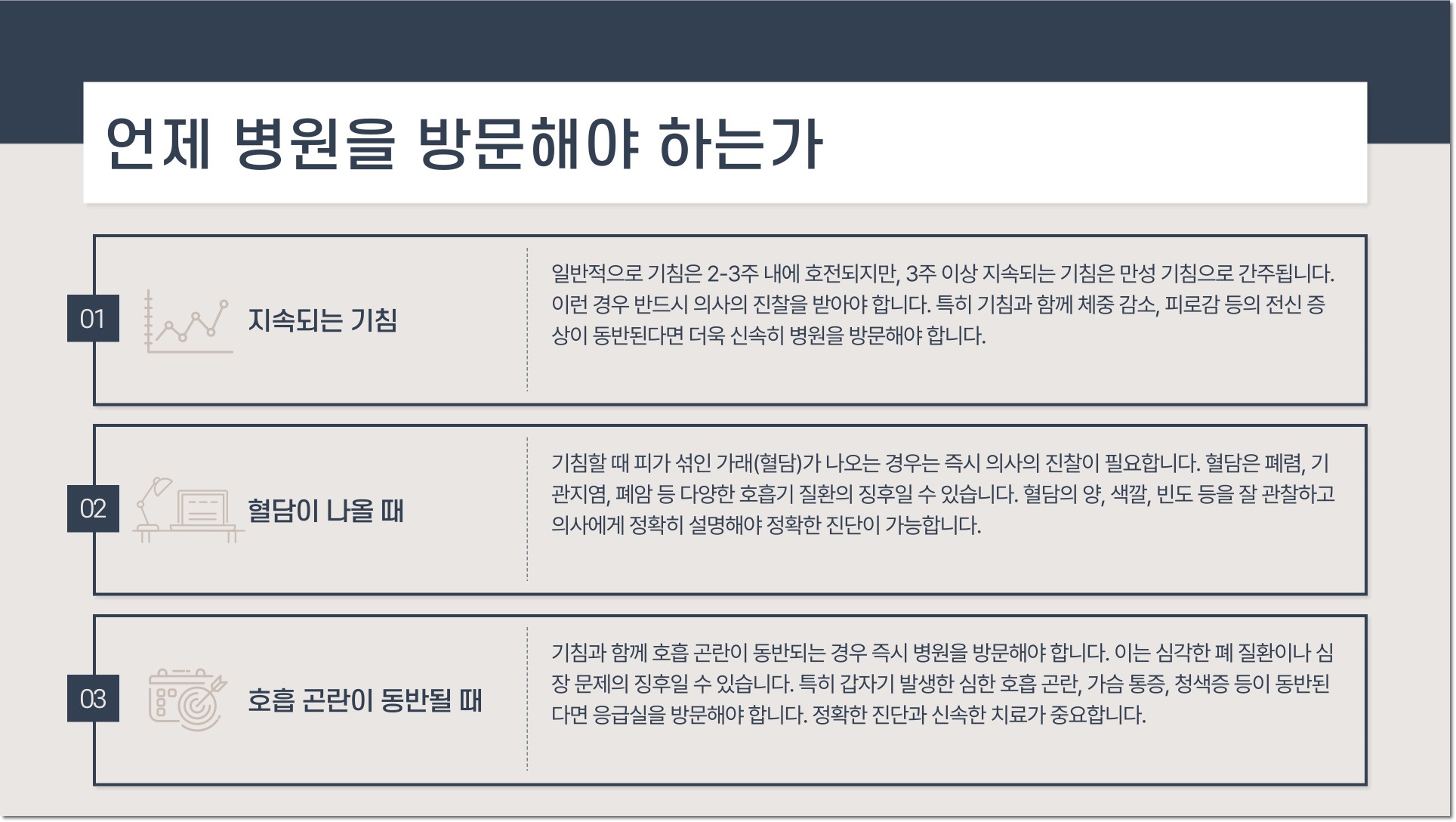 기침 억제제는 마른 기침을 완화하는 데 효과적이며, 거담제는 가래를 묽게 하여 배출을 도와줍니다. 심각한 경우에는 의사의 진단을 받는 것이 필요합니다. 만약 기침이 3주 이상 지속되거나, 기침과 함께 열, 호흡 곤란 등의 증상이 나타난다면 즉시 병원을 방문해야 합니다.