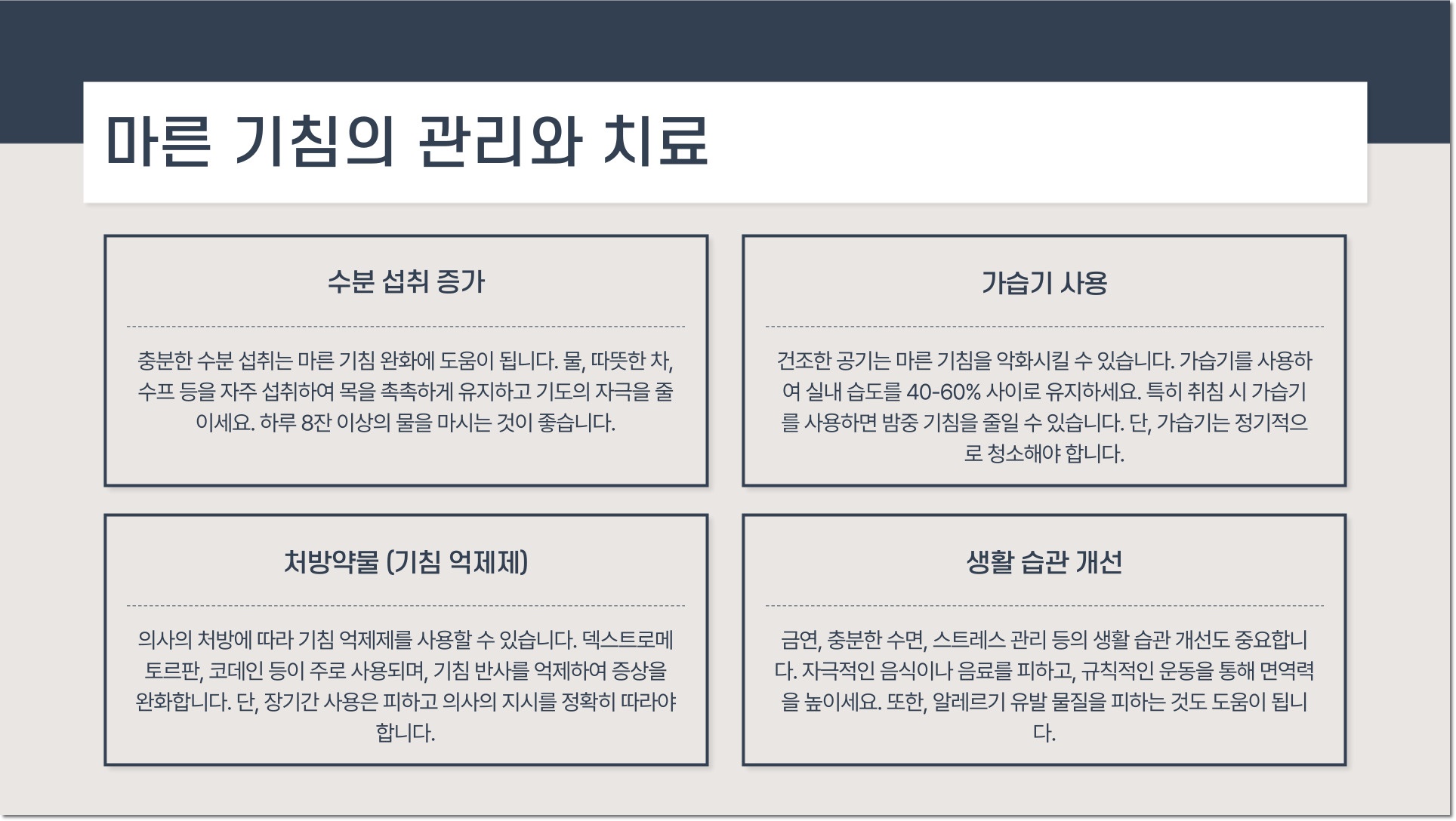 필요할 경우 OTC 약물을 사용할 수도 있지만, 권장 섭취량을 준수해야 합니다. 이러한 방법들의 조합을 통해 마른 기침의 증상을 완화할 수 있습니다.