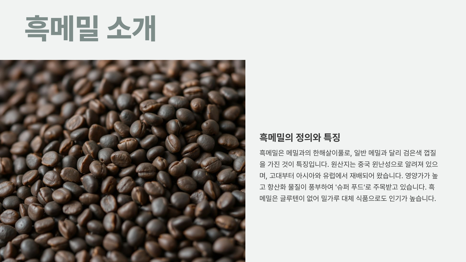 흑메밀은 일반 메밀보다 더 진한 검은색을 띠는 메밀의 일종으로, 일반 메밀에 비해 영양소가 풍부하여 건강에 매우 좋은 식품입니다. 중국에서는 '약 메밀', 일본에서는 '쓴 메밀'이라고 불리며, 예로부터 약용으로 사용되어 왔습니다.