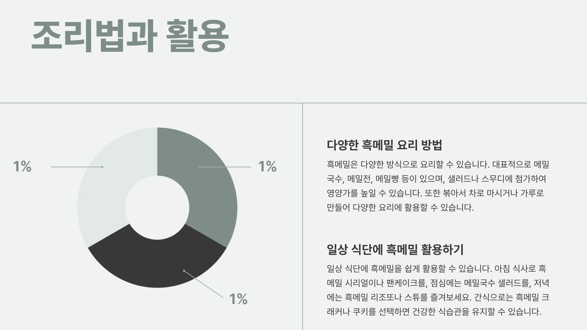 흑메밀은 영양소가 풍부하여 건강에 매우 좋은 식품입니다. 꾸준히 섭취하면 항산화 작용, 고혈압 예방, 당뇨병 예방, 콜레스테롤 감소, 소화 기능 개선, 모발 건강 증진, 다이어트 효과, 뼈 건강 증진 등 다양한 효능을 얻을 수 있습니다. 건강한 식습관과 꾸준한 운동을 함께 실천하면 흑메밀의 효능을 더욱 극대화할 수 있습니다. 흑메밀을 활용한 건강한 식단으로 활기차고 건강한 일상을  즐겨보세요!