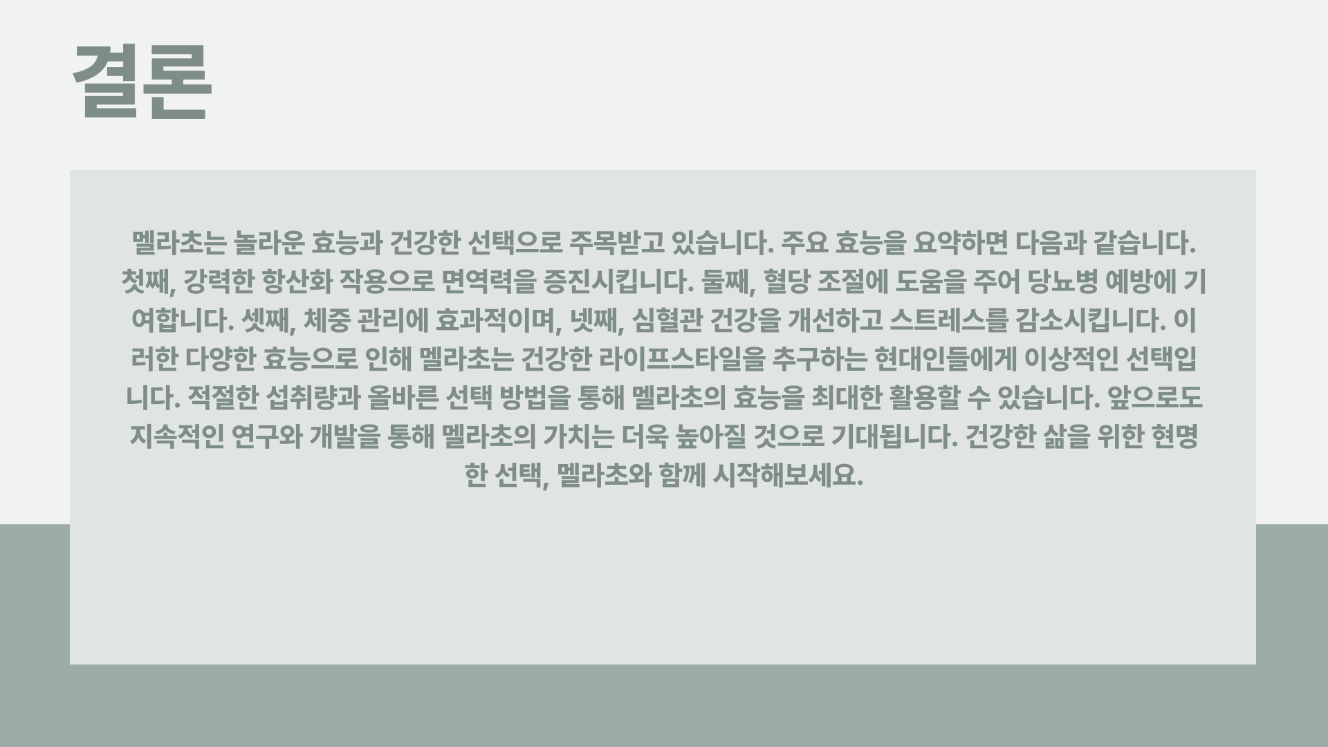 멜라초는 다양한 건강 문제를 치료하는 데 사용되는 전통적인 약초로, 진통 및 진경 효과, 어혈 제거, 혈액순환 개선, 위액 분비 억제, 항산화 작용, 항균 및 항염 작용, 부인병 예방, 정력 증진, 신장 건강 개선 등의 효능을 가지고 있습니다. 건강한 식습관과 꾸준한 운동을 함께 실천하면 멜라초의 효능을 더욱 극대화할 수 있습니다. 멜라초를 활용한 건강한 식단으로 활기차고 건강한 일상을 즐겨보세요!