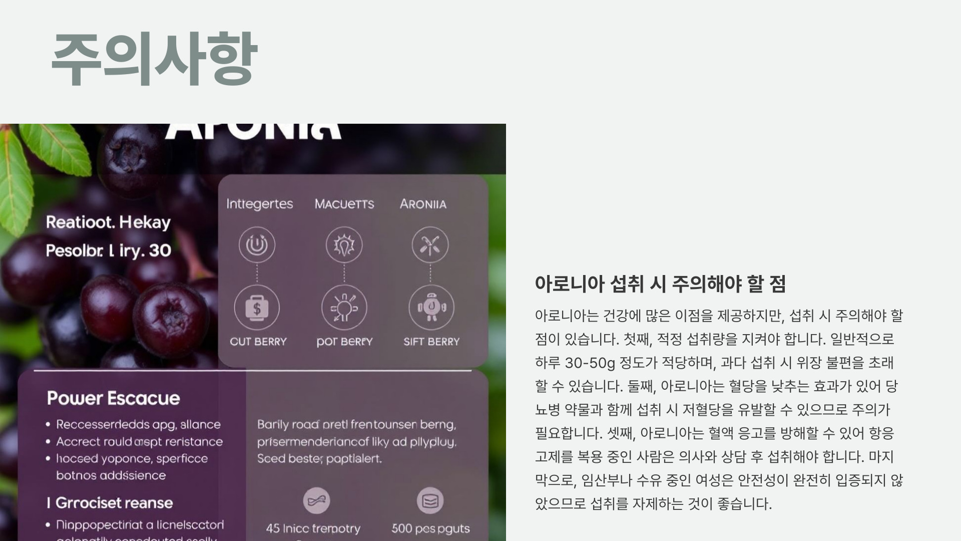 아로니아는 탄닌 성분이 많아 떫은맛이 강하므로, 섭취 전에 충분한 물과 함께 먹는 것이 좋습니다. 또한 소화기가 약한 사람은 복통이나 설사를 유발할 수 있으므로 주의해야 합니다.