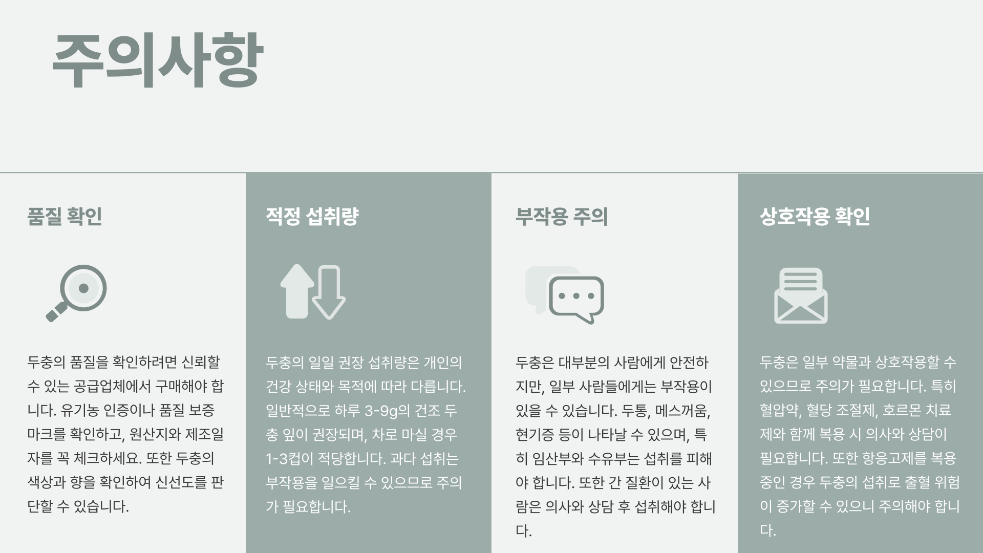 두충은 다양한 건강상의 이점을 제공하는 건강식품입니다. 근육과 뼈 강화, 혈액 순환 개선, 간 기능 개선, 항산화 작용, 항균 작용, 이뇨 작용, 불면증 개선, 여성 건강 증진 등의 효능을 가지고 있습니다. 건강한 식습관과 꾸준한 운동을 함께 실천하면 두충의 효능을 더욱 극대화할 수 있습니다. 두충을 활용한 건강한 식단으로 활기차고 건강한 일상을 즐겨보세요!