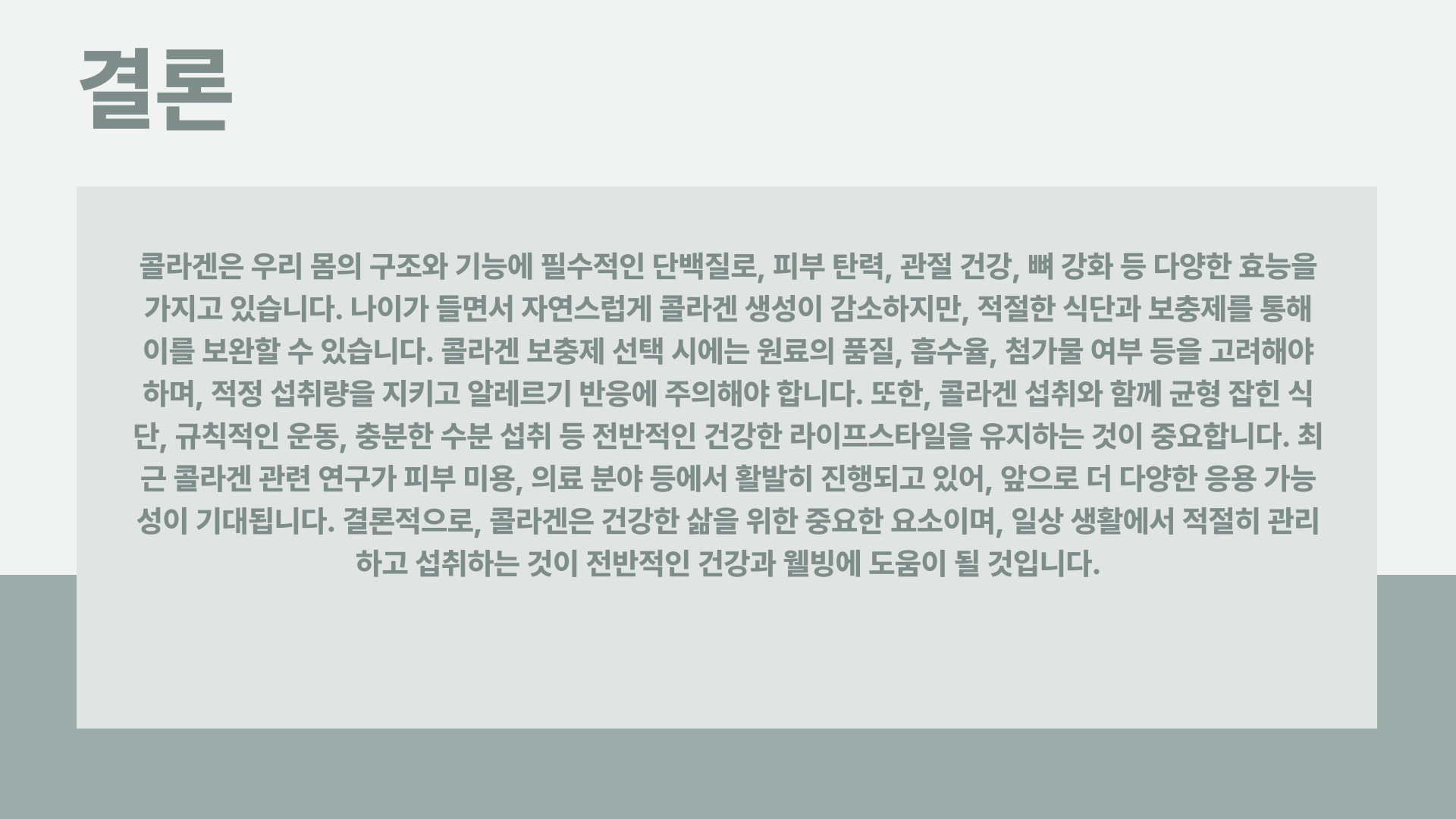 콜라겐은 식품이나 영양제, 화장품 등 다양한 형태로 섭취할 수 있으며, 개인의 체질과 건강 상태에 따라 적절한 양과 방법을 선택하는 것이 중요합니다. 콜라겐의 효과를 높이기 위해서는 비타민 C, 비타민 E, 철분, 칼슘 등의 영양소와 함께 섭취하는 것이 좋습니다.